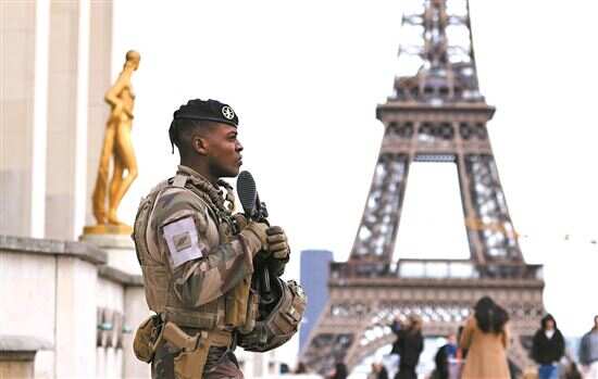■3月25日,法国士兵在巴黎特罗卡德罗广场附近巡逻警戒。 新华社发 |