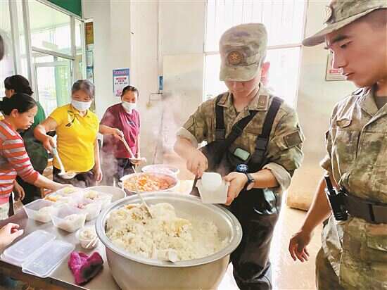 ■廖阿姨和镇上的妇女们给救援人员分饭菜。 |