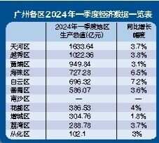 越秀首次突破千亿元大关 获亚军 广州市统计局4月27日发布消息,2024年一季度,广州市地区生产总值为7161.14亿元,同比增长3.6%。近日,广州各区也陆续公布一季度的经济统计数据。其中,天河区地区生产总值为1633.64亿元,排名全市第一名;越秀区首季GDP首次突破千亿元大关,为1022.36亿元,排名全市第二名;白云区和海珠区增速分别达7.2%和6.5%,排在全市前列。从排名来看,与去年同期数据排名相比并无变化。不过,截至记者发稿时,南沙区仍没有公布相关数据。 天河区一季度GDP仍是全市冠军 今年一季度,天河区的GDP依然排在各区第一位。根据天河区的统计,1月至3月该区现代服务业实现增加值1246.05亿元,增长3.2%,占GDP比重76.3%。其中,信息传输、软件和信息技术服务业增加值增长6.1%;规模以上营利性服务业营业收入(错月数据)增长9.1%。其中,规上租赁商务服务业营收增长17.4%,规上科学研究技术服务业营收增长17.8%。 此外,战略性新兴产业实现增加值475.57亿元,增长5.7%,占全区GDP比重29.1%,同比提升1.7个百分点。其中,新材料与精细化工、轨道交通、生物医药与健康分别增长15.2%、7.9%、6.8%。数字经济核心产业实现增加值371.61亿元,增长7.2%,占GDP比重22.7%,同比提升2.2个百分点。 值得关注的是,越秀区一季度GDP也突破了千亿元大关。其中,第二产业增加值为25.54亿元,同比增长15.9%;第三产业增加值为996.83亿元,同比增长3.5%。越秀区营利性服务业增势良好,1月至2月(错月数据),全区规模以上营利性服务业实现营业收入同比增长9.0%,增速比上年同期大幅提升14.1个百分点。其中,租赁和商务服务业(15.6%)、居民服务业(8.1%)、互联网和相关服务(0.4%)、软件和信息技术服务业(6.6%)比上年同期分别提升23.7个、22.9个、14.7个和6.0个百分点。 白云、海珠两区增速领跑全市 一季度,白云区的GDP以接近700亿元排名各区第五名,增速7.2%排名第一名;海珠区的GDP则超过700亿元,排名高出白云区一位,增速6.5%排名第二名;在以往竞争激烈的四、五、六名之争中,番禺区增速为3.6%,GDP接近600亿元,还需要找到新的增长点方能加入海珠、白云两区的竞争中。 根据白云区的统计数据,该区一季度工业生产较快增长,新兴产品制造业向前跃进。一季度,白云区规模以上工业总产值同比增长6.3%。创新驱动力不断增强,新能源产业集群中的锂离子电池、太阳能电池(光伏电池)产量分别同比增长45.6%、1.4倍,环境污染防治专用设备产量同比增长10.3倍;新一代信息技术产业集群中的工业机器人产量增长57%。白云消费市场也在持续复苏,升级类商品快速增长。一季度全区社会消费品零售总额324.79亿元,同比增长4.9%,比广州市高1.4个百分点。 此外,白云区服务业也在高位运行,1月至2月(错月数据),全区规模以上服务业实现营业收入同比增长25.7%。重点行业中,租赁商务服务业表现亮眼,实现营业收入同比增长20.6%。再加上固定资产投资规模扩大,白云区增长的基石更加牢固。一季度,全区固定资产投资突破270亿元,同比增长7.6%。工业投资完成投资额31.45亿元,同比增长67.6%,其中制造业完成投资23.92亿元,同比增长38.3%。 海珠区除了GDP增速排名第二名,固定资产投资额、税收收入分别增长18.7%、20.9%,同样排名全市各区前列。 该区工业、新一代信息技术服务业、租赁和商务服务业三大优势行业聚合力齐发力,作为全区经济发展核心引擎,有力拉动全区经济增长。其中,数字经济核心产业“四上”企业一季度实现营业收入237.02亿元,增长28.5%。腾讯、头条、阿里、唯品会、蚂蚁五大平台型企业一季度增长58.4%,引领带动作用显著。 从发展潜能看,海珠区重点项目建设稳步推进。新增中南钢铁总部大厦、海珠殷勤湿地里项目和中联商业广场改造工程等12个项目,紧盯576个重点投资项目,推进地铁11号线、12号线,海珠湾隧道工程,琶洲西区地下综合管廊工程等基础设施项目赶工冲刺。 在招商引资方面,海珠区多点发力,引进落地淘宝AI服饰、蚂蚁奥星贝斯等优质项目36个,预计达产营收规模超210亿元。同时重点推动琶洲11个产业用地、10个新竣工总部楼宇和10个全新产业园区招商。 增城区增速从“领跑组”跌至“追逐组” 与去年增速领先相比,增城区2024年一季度GDP增速为1.8%,从“领跑组”落到了“追逐组”。同样从领跑者变追逐者的还有黄埔区,与去年一季度一样,黄埔区GDP排名低于越秀区。不过去年经过二季度的追赶,黄埔区在半年GDP排名中反超越秀区,并且一直保持领先优势至年底。一季度黄埔区公布的GDP增速也高于去年全年的平均值,接下来依然有潜力再度实现反超。 另一方面,去年增速经历由负转正的花都区,今年一季度增速高于全市水平,其中,第一产业增加值为7.62亿元,同比增长12.2%;第二产业增加值为125.58亿元,同比下降2.2%;第三产业增加值为235.32亿元,同比增长7.5%。 从具体数值来看,花都区固定资产投资及消费市场增长对经济数据贡献较大。一季度花都区固定资产投资(按项目在地)同比增长8.0%。其中,建设改造投资同比增长25.6%,工业投资同比增长19.9%。从产业结构看,第一产业、第二产业和第三产业同比增幅分别为18.5%、26.8%和4.5%。花都区的消费市场亦保持活跃,全区一季度社会消费品零售总额227.00亿元,同比增长11.1%,增速较去年同期提升3.4个百分点。线上消费市场火热。1月至3月,全区限额以上批发和零售业通过公共网络实现的实物商