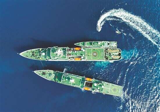 近期,中国海警在我国黄岩岛海域开展维权执法活动期间组织日常训练。 图为5月13日,中国海警3502舰为其他执法舰艇进行海上补给(无人机照片)。新华社发