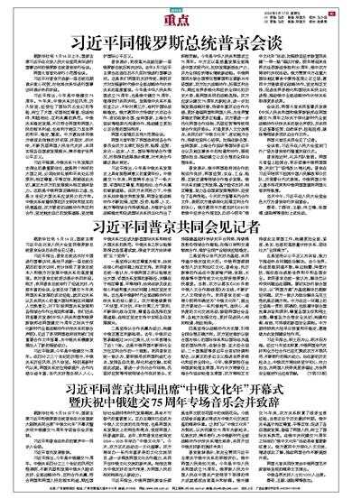 据新华社电 5月16日,国家主席习近平在北京人民大会堂同俄罗斯总统普京会谈后共同会见记者。 习近平指出,普京总统这次对中国进行国事访问,是他开启新一届总统任期后的首次访问,充分体现了普京总
