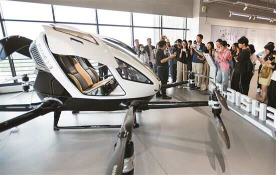 ■5月14日,在亿航智能设备(广州)有限公司展厅,工作人员为媒体记者介绍EH216-S载人级无人驾驶飞行器。 |