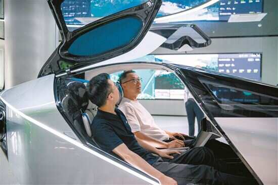 ■5月15日,参观者在广州市番禺区小鹏汇天总部体验飞行汽车旅航者X2。 |