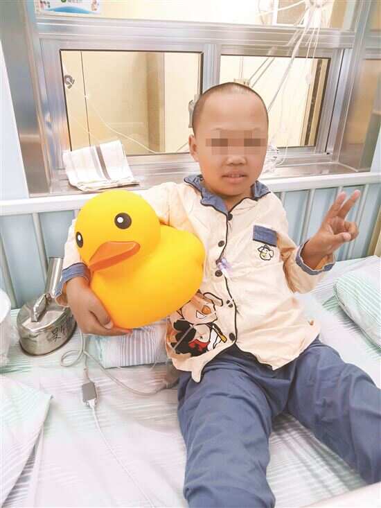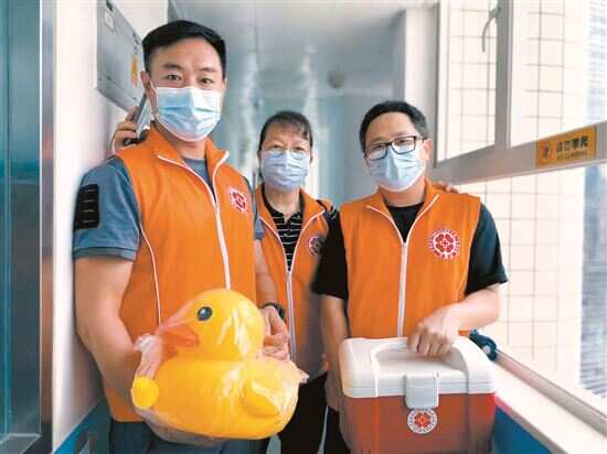 中华骨髓库的工作人员护送造血干细胞到医院后,到移植仓外探望小锋,并送上寓意打气的“加油鸭”。 |