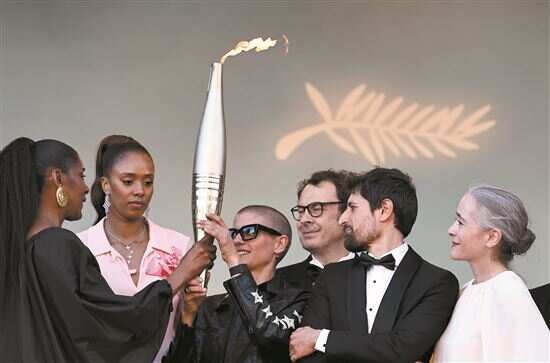 5月21日,在法国南部小城戛纳举行的第77届戛纳国际电影节上,法国残疾人自行车运动员玛丽·帕图耶(左三)接过巴黎奥运会火炬。
