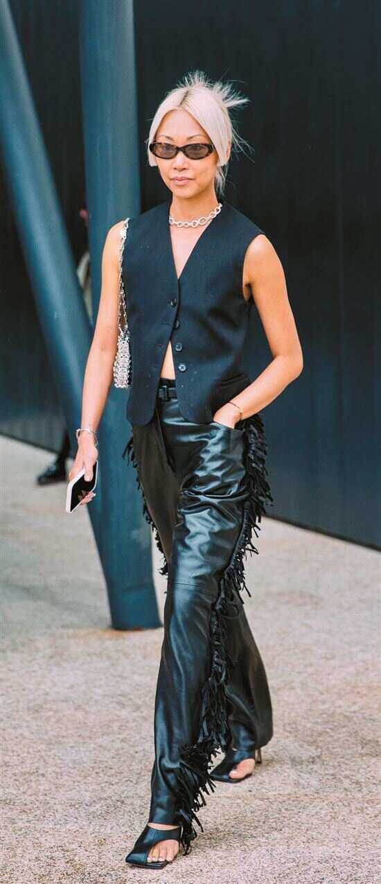 镂空款皮革马甲内搭背心,清凉感和酷感同时在线。 |