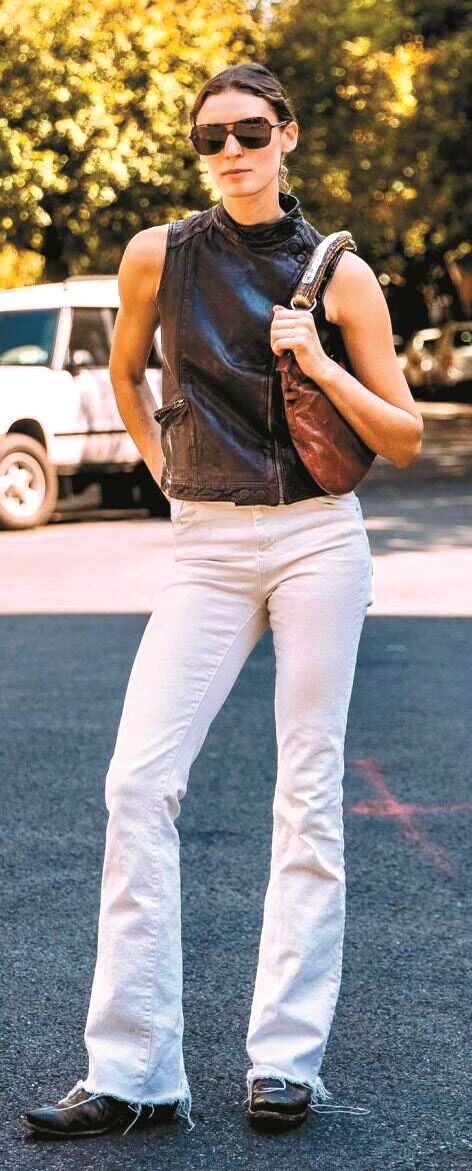 解开下方纽扣让马甲下摆形成倒“V”,搭高腰裤塑造显瘦露腰效果。 |