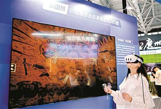 5月23日,在第二十届文博会粤港澳大湾区文化产业创新展的腾讯展区,观众体验“寻境敦煌”VR数字沉浸展。 |