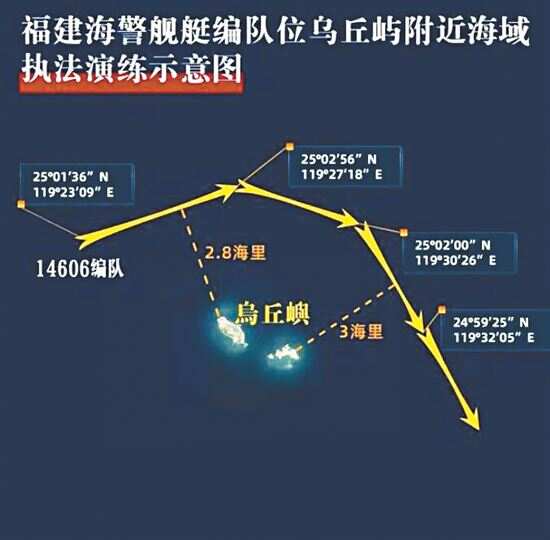 ■福建海警舰艇编队在东引岛、乌丘屿附近海域执法演练示意图。(来源:央视新闻) |