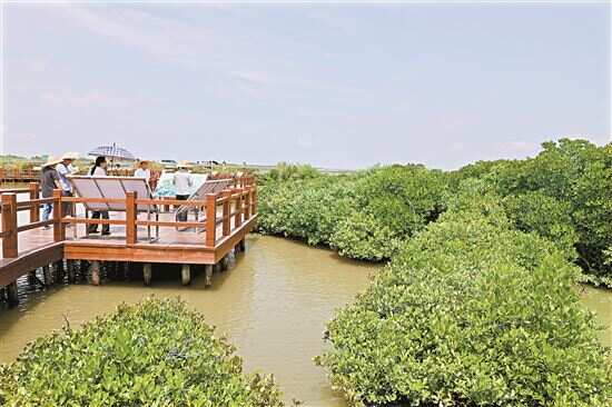 ■湖光镇金牛岛红树林科普基地,游客漫步木栈道近距离欣赏红树林。 |