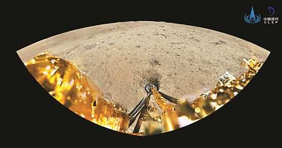 ■由全景相机在嫦娥六号表取采样前,对着陆点北侧月面拍摄的彩色图像镶嵌制作而成。图像上方是着陆点北部查菲环形山,图像的下方是着陆腿和着陆时冲击挤压隆起的月壤。 |