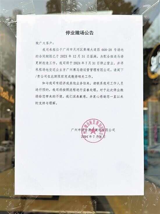 马会家居、马会酒店运营方发布停业撤场公告 近日,广州马会家居、马会酒店运营方发布停业撤场公告,称将于7月31日停止营业并将场地交还给广州赛马运营管理有限公司。 在此之前,跑马场地块的康体娱乐、汽车、部分餐饮等产业已被陆续清退:高尔夫球场已经停业,汽车城基本清空;今年年初开始,马场西路上多家饭店也被回收场地、停业撤离。而随着此次马会家居、马会酒店等撤场后,跑马场地块上的主要产业基本撤离完毕,马场地块的更新改造有望进一步推进。 有商家清样甩货 部分门店已提前撤场 9日下午,新快报记者实地走访马会家居发现,卖场多个出入口的玻璃门上均粘贴有“停业撤场公告”。根据公告,马会家居运营方广州市骏合展览策划有限公司表示,其承租的黄埔大道西668-28号场地已于2023年12月31日届满,为配合推进马场更新改造工作,公司将于2024年7月31日停止营业,并将场地交还给广州赛马场运营管理有限公司,商户需在此期限前完成撤场相关工作。 面对停业撤场通知,有门店店员向记者表示,“确实有点突然,但也有预感,因为今年就没有续签合同了,只是现在确定了具体时间。”马会家居卖场内,商户们均正常营业,但前来购物的顾客寥寥无几。部分门店门口放置有“全场清样”“清样3折起”“全场特卖”等字眼的宣传板;还有部分门店已提前撤离,其店内虽然亮着灯,但已经空荡荡,门头的品牌logo也清除了。 经营相对低效 马场地块亟待转型开发 据了解,此次停业撤场的除了马会家居,还有马会酒店及其水疗门店和附近餐饮店。根据粘贴在马会酒店门口的“停业撤离公告”,运营方广东关键实业发展有限公司表示,其承租的黄埔大道西668-9、10号场地已于2024年3月31日届满,公司将于2024年7月31日停止营业,并将场地交还给广州赛马场运营管理有限公司。 公开资料显示,跑马场地块位于珠江新城核心地段,其北至黄埔大道,西至马场西路,东至潭村路,南至马场北路,占地面积38万平方米,面积相当于53个国际标准足球场,也是广州现有商圈正佳广场的6.66倍以上。周边分布着AAA级写字楼和多处豪宅,是名副其实的黄金地块。然而,长久以来,马场地块经营相对低效,与CBD的功能定位极不相称,亟待转型开发。 天河区推进更新改造 争取华联SKP等项目早日落地 商户全部撤离后,跑马场地块下一步将如何更新改造?记者尝试联系广州赛马运营管理有限公司进行了解,但暂未获答复。关于马场地块的规划消息,中国政府采购网曾于2021年挂出一份《天河区马场地块功能提升发展策划项目竞争性磋商公告》,对马场地块进行功能提升发展策划项目招标。该公告明确要对标北京SKP等国际著名CBD地区,按照粤港澳大湾区核心城市、广州打造全球活力城市和“老城市新活力”的发展要求,对该地块进行科学定位。 一时间,“SKP进驻广州”的消息开始流传。北京SKP即北京华联(SKP)百货有限公司,是北京华联集团等投资兴建的一家合资百货公司,被誉为“中国高端商场的示范性样本”,是国内高奢商业体代表。今年年初,有媒体报道称,北京华联SKP团队已经入驻广州西塔办公,准备项目落地广州的前期工作。但至今,广州SKP的位置尚未官宣,也未确定是否落地在马场板块。 不过,根据天河区政府公众号“广州天河发布”透露,在今年2月召开的全市高质量发展大会上,天河区也重点提到,要“积极推进马场地块更新改造,争取华联SKP等项目早日落地”。随着此次马会家居、马会酒店等清场后,跑马场地块上的主要产业基本撤离完毕,马场地块的更新改造有望进一步推进。 ■采写:新快报记者 谢佳熳
