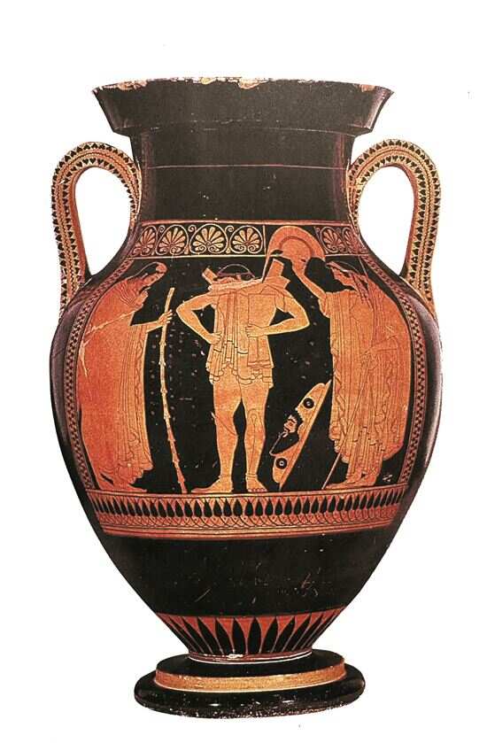 ■辞行出征的战士,约公元前510-前500年,红像式花瓶,有攸西米德斯的署名,高60cm。希腊花瓶。图片来自《艺术的故事》 |
