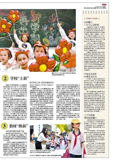 2 学校“上新” 多区学校上新,名校新增新校区 根据广州市教育局统计,全市基础教育阶段学校(含幼儿园、中小学、特殊教育学校、外籍人员子女学校)3839所,在校生253.57万人。今年秋季学期广州市全市新开办公办中小学(校区)51所,其中幼儿园26所、小学15所、初中2所、九年制4所、完全中学1所、高中3所,新增基础教育公办学位约3.38万个。 记者从花都区教育局获悉,花都区今年新增7所学校(校区)招生,包括广州市第六中学花都校区初中部、广州市花都区空港学校小学部、广州市花都区邝维煜纪念中学附属小学、广州市花都区狮岭镇冠华第三小学、广州市花都区新华四小附属珑华小学、广州市花都区新雅街尚雅小学(清潭校区)、广州市花都区新华街横潭小学。其中, 广州市第六中学(花都校区)规划办学规模54个教学班,初中24班,高中30班。本学期招收初一新生,开设8个教学班,目前,广州六中教育集团已形成“一校三区”(海珠校区、从化校区、花都校区)的办学格局。 荔湾区方面,广州市荔湾区西关广雅实验学校大坦沙校区、广东外语外贸大学附属荔湾小学、荔湾区青少年宫附属幼儿园(天启园)、荔湾区青少年宫附属幼儿园(璇湾园)等四所新建学校(幼儿园)也迎来了首年开学。其中,西关广雅实验学校大坦沙校区作为广雅教育集团的成员校,将系统构建和着力实施“未来课程”,目前该校初一8个班324名学生在崭新的校园中开启了初中阶段的学习生活。 9月1日,白云区颜乐天纪念中学今年复办后首次迎新,该校以高铁登车式的创意主题,为新生们打造了一场别开生面的欢迎仪式。在热闹的醒狮表演后,在领导、全体教师、家长代表的共同见证下,手持车票的学子们通过检票台,登上了“铁一联盟校颜乐天纪念中学站”,将在颜乐天纪念中学开启人生新篇章。记者了解到,颜乐天纪念中学坐落于白云区均禾街七星岗,占地面积153亩,是白云区校园面积最大的公办学校。该校于2019年停招、2022年9月停办。2023年,白云区人民政府与广州市铁一中学签署委托帮扶协议,由广州市铁一中学帮扶颜乐天纪念中学复办。新学期该校迎来6个高中班,5个初中班开学,其中高一共300人,初一共214人。 记者从黄埔区教育局了解到,新开办公办学校(校区)共有8所,包括黄埔军校纪念中学北校区、苏元学校东校区、铁铮学校东校区、开元学校西校区、广州知识城南安置区二期小区配套小学(暂定名)、华南师范大学附属中学知识城小学、新港小学南校区、黄埔区实验小学等,为黄埔区带来超过1万个优质公办学位。 海珠区今年9月也将开办一所公办小学,即广州市海珠区宝玉直实验第二小学,该校办学规模为18个教学班,今年9月开设一年级3个班。 3 教材“换新” 语文教材整体难度下降 新学期,起始年级学生用上了“新教材”,在广州大学附属小学,记者看到,一年级学生的语文、数学、科学等教材封面都注有“国家教材委员会专家委员会审核通过2024”字样。 一年级(10)班班主任张超梅老师介绍道,新版的一年级语文教材有三大变化,一是在选文上有所调整,课文由原先的14篇减到现在的10篇;二是拼音单元的调整,以前是两个单元,现在分为三个单元,减缓了拼音学习的坡度;三是整体上的难度有所下降,让学生可以更好地适应幼小的衔接、更快适应小学的学习生活。 开学首日,平安走起 出动警力1.52万人次护航 为保障开学平安有序,广州警方提前部署开展安全检查工作,开学首日全面落实上学、放学时间护学岗工作,加强校园周边巡逻防控工作,确保“见警车、见警灯、见警察”。当天上午,广州警方共出动警力1.52万人次,设置定点值守和巡逻护学岗共4500个、护学交通岗92个、查车点37个,确保全市中小学开学首日平安有序。 开学前,广州警方会同教育等部门,对全市所有中小学、幼儿园开展安全检查,推进学校强化人防、物防、技防建设提档升级。对发现的风险隐患,逐一对接整改完毕。 交警部门会同教育、应急、交通运输等负责行业管理的政府部门,对全市自有校车学校、校车企业开展全面督导检查,对校车驾驶人驾驶证资质进行全面核查,对全市所有学校及周边道路开展全线摸排,完善校园周边交通标志标线等基础设施。同时,在全市11个区956所学校继续推行“校家警”管理模式,发动学生家长、值日教师、学校保安等共同维护校园门口交通秩序。 严查全市校车交通违法行为 开学第一天,路面上接送学生的校车也多了起来。为了保证交通顺畅和学生安全,广州交警从清晨开始就沿路检查校车。在接送学生期间,校车若没有按照规定线路行驶,则交警会依据相关法律法规对校车进行处罚。 据广州交警介绍,为保障开学日的全市交通秩序,交警部门在全市范围内严查校车的交通违法行为。周一清晨7时许,在白云区沙太北路,记者看到多辆黄色校车被交警拦下,在检查证件后,按照规定线路行驶的校车会被立即给予放行,而违反规定线路行驶的,则会被处以200元的罚款。据记者观察,在1小时之内,有3辆校车被检查出违规。有违规的司机表示,对于交警的处罚表示理解,自己的确是带着学生走了其他路线。 上下学高峰增派路面警力 为保障返校师生交通出行的安全,广州交警还在上下学高峰增派了路面警力,在学校出入口等重点路口、路段设置了92个“交通疏导岗”,开展交通疏导、驱离违停车辆、纠正交通违
