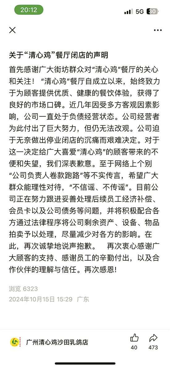 闭店半个月后,“清心鸡”微信公众号发布声明称: 10月14日,《新快报》报道了广州多家“清心鸡”门店暂停营业的消息。就在一天之后,沉寂许久的“清心鸡”微信公众号发出一则公告,称老板跑路传言不实。 声明提到,近几年因受多方因素影响,公司一直处于负债经营状态。尽管公司经营者为此付出了巨大努力,但仍无法改观。公司迫于无奈才做出停业闭店的决定。 声明对“公司负责人卷款跑路”等传言进行了回应,并称公司正在努力跟进妥善处理后续员工经济补偿、会员卡以及公司债务等问题。 业内声音 注重本土食材和文化结合 地方特色菜系更吸引年轻人 针对“清心鸡”闭店风波,新快报记者也在近日采访了一位餐饮界人士。这位业内人士指出,广州人爱吃鸡,可以用“无鸡不欢”来形容,传统的酒楼餐厅几乎都有一个自创的品牌“鸡”。而“清心鸡”以鸡为主打菜式,利用开分店的方式来扩大影响,多年来在市场上赢得口碑。但时过境迁,粤菜也遇到了瓶颈,“首先就是竞争,现在‘吃鸡’已经成为寻常事。在广州,去哪里都可以吃到不同品种的鸡,消费者面临多种多样的选择。本地的饮食习惯已经不是餐饮成功的利器,而是一种常规的东西,所以‘清心鸡’失去了竞争力。”这位业内人士指出。 他指出,从广州餐饮的版图来看,粤菜目前受到了各种菜系的融合和冲击。特别是一些有地方特色的菜系,比如湘菜、川菜、云南菜等。“它们注重本土食材和文化的结合,更能吸引一些比较喜欢新鲜、颜值、特色文化的年轻消费者。” “‘清心鸡’的消费模式中包含预售的方式,就是会员卡储值,买多少再送多少。我个人建议消费者还是要谨慎,”针对目前众多餐饮门店的消费模式,这位业内人士建议消费者要慎重,可以多留意线上平台的团购等实惠的消费方式。 律师说法 公司需及时补发员工工资 应与消费者协商退款方式 “对于这类闭店停止经营的情形,经营者当然是要保证员工的工资,及时补发,这是首要的义务。补发之后,公司可以将其剩余的财产进行变卖处置。再和消费者进行沟通,如何退回相应的押金或者预付款。”广东国鼎律师事务所合伙人、公益律师廖建勋对此表示。 廖律师表示,门店如果没有足够的资金退还给充值的消费者,可以与消费者协商,以其他的物品来抵扣相应的预付款或押金。或者是承诺以其他商品、服务来进行抵扣,但这个必须要与消费者进行沟通协商,双方同意。“如果通过上述情况,仍然不能偿还相应的债务,那么公司可以向人民法院提交破产申请,由法院来裁定,消费者可以进行债权申报,来处置相关公司的财产和债务。”廖律师说。 ■新快报记者 贾典