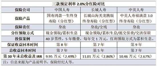 “分红险的时代来了”“底薪+提成,分红险的收益可期”……随着分红险的预定利率降至2.0%,此类产品成为行业新宠,多位代理人开启花式宣传。新快报记者测评发现,新上线分红险的保证收益和预期分红均有下降。业内人士表示,分红险的红利为不保证收益,消费者应综合考量评估。 ■新快报记者 林广豪 一般提供身故/全残保障 根据监管部门相关通知,自今年10月1日起,分红型保险产品预定利率上限下调至2.0%。此轮调整后,分红险被寄予厚望。多家大型险企表示,计划将分红险销售占比提升至50%以上。 与近年火热的终身寿险不同的是,分红险的收益表现为低保证、高浮动。回看预定利率2.5%的分红险,有业内人士测算,持有30年,保证收益的内部收益率(IRR)一般在1.9%-2.2%,总收益IRR一般在3.1%-3.5%。 预定利率2.0%的分红险表现如何?新快报记者结合产品关注度、上线时间等因素,选取中国人寿的“国寿鸿盈一生终身寿险(分红型)”(下称“国寿鸿盈”)、长城人寿的“长城山海关龙腾版终身寿险(分红型)”(下称“长城山海关”)、中英人寿的“中英人寿福满盈3.0终身寿险(分红型)”(下称“中英福满盈”)进行对比。 保险责任方面,分红险一般提供身故、全残保障,国寿鸿盈和中英福满盈仅有身故保险金,长城山海关拥有身故/全残保险金。以40岁男性李先生为自己投保为例,选择5年缴费,每年交1万元,红利领取方式为累积生息。李先生50岁时,三款产品的身故保障均为7万元。 红利能否实现要关注 投资方面,分红险的红利领取方式主要包括现金领取、累积生息、抵交保费、交清保额,长城山海关和中英福满盈提供上述四项方式,选择相对多样。 有保险代理人告诉记者,分红险的保证收益常被比作“无责底薪”,往往是首要关注点。从李先生的投保情况来看,国寿鸿盈、长城山海关和中英福满盈保证收益的回本时间(即收益超过所缴纳保费)分别为第8年、第7年、第9年。 其次,红利作为分红险的一大特点,必然是投保人对比产品的关键。叠加分红收益,李先生投保国寿鸿盈、长城山海关和中英福满盈总收益的回本时间分别为第7年、第5年、第7年。将时间拉长,第30年末,国寿鸿盈、长城山海关和中英福满盈的总收益分别为9.95万元、11.01万元、10.46万元,IRR分别为2.49%、2.86%、2.67%,其中红利收益对应为2.23万元、3.12万元、2.92万元。 再者,分红险的红利能否实现也是投保人需关注的问题,分红水平过低或被诟病为“画饼”。消费者可结合险企在官网披露的红利实现率、保险公司的经营状况等因素综合考量。其中,红利实现率大于100%代表实际派发的红利高于产品演示的红利,反之则是分红水平不及预期。此外,产品长期的分红情况值得参考。 险企的官方数据显示,分红险的分红情况不达预期并不鲜见。例如,中国人寿某款分红险2023年度的红利实现率仅为25%;长城人寿的某款分红型两全险2024年度红利实现率仅为20%;中英人寿分红险2023年度的红利实现率在48%-101%。