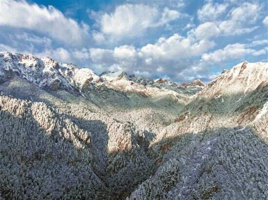 ■近日,位于甘肃省陇南市宕昌县的官鹅沟森林公园迎来降雪。新华社发 |