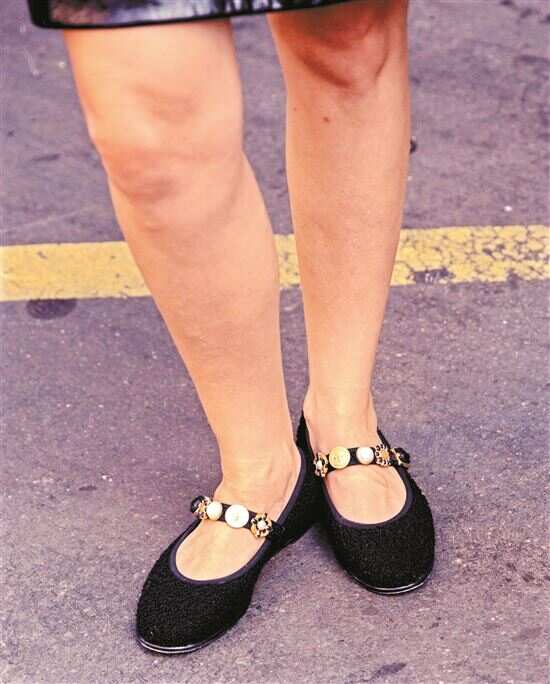 选丝绒玛丽珍鞋一定要注意选不软塌塌的材质,鞋面上加些配饰,展现小面积精致,并适当化解“老气”。 |