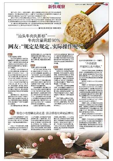 弹牙、多汁、手打……看完关键字,一颗从火锅里捞出来的牛肉丸是不是已经出现在你的脑海中。作为潮汕美食的代表之一,这颗“丸”已成为潮汕文化的重要符号与地域名片,各地街头的火锅店标上“汕头牛肉”“汕头牛肉丸”才能彰显其“正宗”。 然而,不是什么牛肉丸都能自称汕头牛肉丸。1月6日,新修订的《广东省食品安全地方标准汕头牛肉丸DBS44/005-2024》(下称“汕头牛肉丸新标”)落地实施,其中广受关注的是,新标准明确要求汕头牛肉丸中牛肉含量须超过90%,或牛肉与牛筋总含量达到90%以上。 为一颗牛肉丸制定标准有意义吗?这份美味如何通过地方性标准来完善?新快报记者走访并采访各方人士,探寻汕头牛肉丸的“丸”美之路。 ■本版文图:新快报记者 李斯璐 潘芝珍 修订 牛筋丸被纳入新标 汕头牛肉丸新标由广东省卫生健康委发布,根据2016年版本进行了修订。新快报记者对比发现,新旧版本从汕头牛肉丸的定义、成分、标签到包装要求都作出了新修订,共14项修改。 关于定义,2016年版本中,汕头牛肉丸是指以鲜、冻分割牛肉为原料(牛肉含量大于90%)……而在2024年修订版中改为,汕头牛肉(筋)丸是指以鲜、冻分割牛肉(含或不含牛筋)为原料(牛肉含量大于90%,或牛肉与牛筋含量之和大于90%),不包括牛的食用副产品(内脏、脂、血液、骨、皮、头、蹄、尾等),添加适量水、食用盐、淀粉及其它辅料,以汕头传统槌打或机械方式糜化,制成丸状、固化成型的具有独特地方特色的非即食调制肉制品。 修改理由认为,一直以来,汕头就把牛肉丸分为“牛肉丸”“牛筋丸”两种,牛筋丸也归属于牛肉丸类,但加入牛筋和纯肉的制品口感有明显不同,因此增加了“牛筋”的含量和定义在里面。 在口感味道方面,除了原料、配料须符合国标之外,2024年修订版将原有的理化指标调整至“脂肪/(g/100g)≤12”,新增了过氧化值,考量油脂发生氧化程度。 走访 包装上难见牛肉含量 对广东人来说,秋风起,打边炉,清汤牛肉锅,必下牛肉丸。汕头牛肉丸爽脆嫩滑、富有弹性,但“百方有百味”,汕头牛肉丸新标的实施,对市民购买牛肉丸会有影响吗? 记者走访了广州部分潮汕汤粉店和火锅店,发现不少餐厅的牛肉丸都标称“手拍”“手锤”,但甚少能看到关于牛肉含量的信息。 在体育西横街一家生意红火的汕头牛肉火锅店,商家向点餐的客人介绍:“我们的牛肉丸除了添加少量水和淀粉外,全部都由鲜牛肉制成。”其冷冻牛肉丸的外卖价格为68元/斤。但在售卖的牛肉丸的包装上,并未看到牛肉含量、或牛肉牛筋总含量的信息。“像这类牛肉丸,是正宗‘汕头牛肉丸’吗?”一位食客在买和不买之间,摇摆不定。 记者在几款买菜平台上看到,大多牛肉丸都是标称“潮汕牛肉丸”,配料表中都能看到所含成分,但不管是“科技与狠活”的肉丸还是配料表非常干净的品牌产品,几乎没有牛肉丸在包装上标明具体的牛肉含量。 热议 “规定是规定,实际操作呢” 有网友认为,如果能严格按照标准来做,牛肉丸应该好吃,品质有保障。但更多网友质疑,这个标准在实际中如何执行?“规定是规定,实际操作呢?”“哪里可以买到达标产品啊,给个指引先”“店里现做的,怎么看出来含量多少”“哪里可以免费监测一下牛肉含量”…… 有网友表示,这标准有些模糊不清,“牛肉含量超90%就是汕头牛肉丸,要不要标明是哪种牛肉,牛的哪个部位,如果是用边角料呢?”“是严格的手锤还是可以机打,手锤的话锤多少下算合格?口感可是差很多。” 网友“柠檬kong要加油”直言,这是汕头牛肉丸标准,人家都叫潮汕牛肉丸,丝毫不影响。网友“猪皮小甜”调侃称,以后可以叫“汕头风味牛肉丸”。 观点 特色小吃想要走高走远 须以标准化带动品牌化 小小牛肉丸都有标准了!在社交网络平台,有网友及商家提出,汕头牛肉丸只是一种小吃,为它单独制定一个地方食品标准是否多此一举? 对此,广州市政协委员、民建广东省委会农业与农村委员会主任付伟认为:“近几年,广东推进一二三产业融合,当中推动农产品食品标准化是一个重要方面。汕头牛肉丸拥有专属的地方食品安全标准,且不断修订,是非常有必要的,并非多此一举。”他指出,一些基层特色农副产品虽然闻名遐迩,但加工形式比较简单,制作过程参照的食品标准仅以符合卫生标准为底线,这是不够的。一二三产业融合之后,对特色农产品有了更高要求,尤其强调农产品食品全链条标准化。标准化犹如可查的“尺度”,可以提升产品的品牌价值。“对汕头牛肉丸而言,想要走得更高更远,就必须走标准化带动品牌化的路子。” 对话 汕头牛肉丸新标起草企业负责人 陈嘉宇: “不合标的不能叫汕头牛肉丸” 牛肉丸不只是汕头独有,还是潮汕地区特产,为何要单独把汕头的牛肉丸“标”起来?新快报记者连线采访了汕头牛肉丸新标主要起草人之一、汕头牛肉丸产业同业公会会长单位潮庭食品副总经理陈嘉宇,解读新规。 新快报:本次修订汕头牛肉丸标准的意图是什么? 陈嘉宇:《广东省食品安全地方标准 汕头牛肉丸》(DBS44/005-2016)实施以来,我们也发现了一些问题,比如牛肉丸产品类型多元化,速冻和非速冻,非即食牛肉丸按照熟肉制品微生物指标要求的适用性,调整脂肪含量会使牛肉丸更爽口爆汁等,这就需要对汕头牛肉丸标准进行修订。 新快报:此项针对牛肉丸的食品安全地