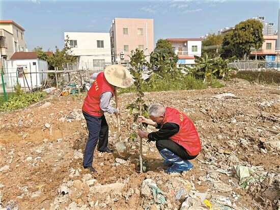 万顷沙市场监管所的党员联合新垦社区群众种下桂花树苗。 |
