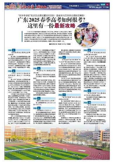 “依学考录取”批次及志愿设置如何安排?普通类与艺体类志愿能否兼报? 广东2025年春季高考志愿填报工作已开始,为帮助广大考生及家长了解今年春季高考的整体情况、具体变化及相关招生录取政策,新快报记者根据广东省教育考试院发布的《关于做好2025年普通高等学校春季考试招生志愿填报工作的通知》和《关于做好广东省2025年普通高等学校招收中等职业学校毕业生统一考试招生工作的通知》等文件内容,梳理了今年春季高考相关招生录取政策的热点问题及解答,助力考生进行科学有效填报,为圆梦大学迈出关键的一步。 ■新快报记者 徐绍娜 实习生 张韫婕 问题1 春季高考招生录取包含哪些类型? 答:目前,广东省春季高考招生主要有5种类型:高职院校依据普通高中学业水平考试成绩招生录取(以下称“依学考成绩录取”)、普通高校招收中等职业学校毕业生统一考试招生(以下称“3+证书考试”)、高职院校自主招生、中高职贯通三二分段、中高职贯通五年一贯制。 问题2 今年广东有多少高校参加春季高考?相比上一年有哪些变化? 答:今年广东共有103所院校在春季高考招生。依学考成绩录取方面,今年共有95所高校参加依学考普通类招生,其中公办院校有67所,民办院校28所。对比2024年,广东理工学院暂停春季招生,韩山师范学院暂停专科批次招生。12所本科院校通过“3+证书”招生1825人,比去年增加了465个计划。 今年美术与设计类共有58所学校招生,包括顺德职业技术学院、广东轻工职业技术大学等。体育类共有27所学校招生,包括广州体育职业技术学院、私立华联学院、广东科学技术职业学院等。舞蹈类共有10所学校招生,包括珠海艺术职业学院、广东省外语艺术职业学院、广东文艺职业学院等。音乐类共有24所学校招生,包括16所公办学校和8所民办学校。“3+证书”考试方面,今年本科批次有12所高校招生,专科批次有96所高校参与招生。 另外,今年多所高校的招生计划有所调整,据初步统计(具体以广东省教育考试院公布为准),今年整体招生计划274617人,相比2024年减少了2240个计划。其中,“3+证书”招生规模较2024年减少了3977人,学考规模较去年增加了1272人。依学考普通类方面,今年共招148287人,对比2024年增加了1700多个计划,总体呈现“公办缩招、民办扩招”的态势。其中,广东交通职业技术学院、广东科学技术职业学院、广东水利电力职业技术学院等公办院校均缩减计划,广州华商职业学院、广东南方职业学院、私立华联学院等民办院校则扩招。 问题3 哪些考生可以填报春季高考志愿? 答:符合以下条件的考生可以报考: ①已参加广东省2025年普通高考报名。 ②报考“依学考录取”的考生,须已参加了我省2025年第一次普通高中学业水平合格性考试语文、数学、英语科目的考试;报考“3+证书”的考生,须已参加了我省2025年“3+证书”考试,所持证书符合相关院校专业技能证书等要求,报考本科层次还需中职就读对口专业。 ③考试成绩达到省招办公布的春季高考录取最低分数线。 问题4 填报志愿时间是什么时候? 答:志愿填报时间:3月13日14:00至17日12:00。 问题5 志愿填报方式是什么? 答:在志愿填报规定时间内,考生凭本人普通高考报名注册账号和密码登录广东省普通高考报名系统(https://pg.eeagd.edu.cn/ks/),选择春季高考志愿填报,使用高考报名时绑定的手机号码接收短信验证码或人脸比对两种方式中的任一种,完成网上志愿填报及确认。 要注意的是,志愿填报不设现场签名确认环节,投档录取以考生网上确认的志愿信息为依据。 问题6 如何查询“依学考录取”和“3+证书”考试招生院校专业信息? 答:2025年“依学考录取”具体招生的院校和专业信息详见《广东省2025年普通高校春季高考统一招生专业目录(普通高中版)》。考生凭本人普通高考报名注册账号和密码登录广东省普通高考报名系统,通过“学业计划查询”栏目也可以查询具体招生的院校和专业信息等。 2025年“3+证书”考试具体招生院校、专业信息和相关证书要求详见《广东省2025年普通高校春季高考统一招生专业目录(中职生版)》。考生凭本人普通高考报名注册账号和密码登录广东省普通高考报名系统,通过“证书计划查询”栏目也可以查询具体招生院校、专业信息和相关证书要求等。 问题7 “依学考录取”批次及志愿设置如何安排? 答:“依学考录取”录取不分批次,分普通类、艺体类(含体育类、音乐类、美术与设计类、舞蹈类)两个大类。艺体类下的音乐类专业省统考分音乐表演和音乐教育两类。其中,音乐表演类包括音乐表演(器乐)方向和音乐表演(声乐)方向;音乐教育类包括音乐教育方向、音乐教育(器乐主项)方向和音乐教育(声乐主项)方向。 普通类设20个院校专业组志愿;艺体类设10个院校专业组志愿。每个院校专业组包含6个专业志愿和1个是否服从专业调剂选项。 问题8 “3+证书”考试招生批次及志愿设置如何安排? 答:“3+证书”考试分本科、高职(专科)两个批次,两个批次同时填报志愿。高职(专科)批次按考生类型分中职生批次、退役士兵批次、内地西藏新疆班批次。 本科批次设1个院校专业组志愿,每个院校专业组设1个专业志愿,不设是否服从专业调剂选项。中职生专科批次设35个院校专业组志愿,每个院校专业组设6个专业志愿,1个是否服从专业调剂选项;退役士兵批次设1