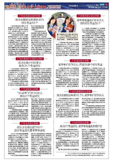 广东机电职业技术学院 总计划数较去年增长43% 招生专业52个 广东机电职业技术学院2025年春季招生总计划数2755人,较2024年增长43%,其中,依学考计划招生794人,面向高中生源;“3+证书”计划招生1981人,面向中职生源。 广东机电职业技术学院今年春季高考招生专业共52个,较2024年增长21%。其中机电一体化技术、建筑智能化工程技术、工业机器人技术、数控技术、新能源汽车技术、人工智能技术应用、电子信息工程技术等理工科专业占比较大。该校相关负责人表示,学校动态调整专业结构,将传统机械类专业全面融入数字化改造课程体系,现代服务业相关专业增加智慧物流等特色模块。两类招生均强化“岗课赛证”融通培养模式,突出职业适应性教育,为先进制造业和现代服务业输送高素质技术技能人才。 广东机电职业技术学院是国家“双高计划”建设单位、国家优质高职院校,目前有南北两个校区。专业方面,该校主动适应地方经济社会发展需要,开设专业53个,形成了以“先进制造业专业群为主体,电子信息业和现代服务业专业群为两翼”的专业格局。学校还积极探索职教本科办学实践,与韶关学院、广东石油化工学院、韩山师范学院等公办本科院校联合办学,搭建“3+2”“2+0”等模式多元的专本衔接路径,2024年专升本人数占毕业生总数的13.2%。 广东环境保护工程职业学院 总计划减少640多人 共有31个专业招生 广东环境保护工程职业学院2025年春季高考招生计划2239人,其中,依学考1438人,“3+证书”751人,自主招生50人。与去年相比,总计划减少了641人。专业方面,该校今年共有31个专业招生,环境检测技术、环境工程技术等优势专业备受关注。 广东环境保护工程职业学院是全日制公办高等职业院校。2021年,学校与广东省环境保护职业技术学校实施集团办学,形成了中高职贯通的办学格局。2022年,该校成为广东省省域高水平高职院校建设单位,现有佛山校区和广州校区,在校学生1.3万余名。学校发扬特色办学优势,紧密对接国家战略发展需要,围绕生态环境产业链,构建专业链,打造人才链,强化服务链,确立了生态环境类专业在省内领先、全国靠前的地位。 广东财贸职业学院 “3+证书”扩招1138人 增加2个专业招生 2025年广东财贸职业学院春季招生依学考和“3+证书”共计划4874人。其中,“3+证书”招2350人,比去年扩招1138人,新增大数据与审计、航空物流管理两个专业在春季招生。 广东财贸职业学院是广东省属唯一的财经商贸类公办高职院校。现有广州、清远两个校区。学校设有数字财会学院、数字金融学院、数字供应链学院、数字商贸学院、数字技术学院、数字创意学院、数字商业产教融合实践中心等12个教学机构,开设大数据与财务管理、金融科技应用、供应链运营、电子商务、国际经济与贸易、人工智能技术应用、数字媒体艺术设计和学前教育等29个专业。学校对接粤港澳大湾区数字商业生态建设专业群,形成以大数据与财务管理和供应链运营专业群为龙头的专业集群,大数据与财务管理专业群是省级首批高水平专业群。该校还在2024年度高等职业教育“创新强校工程”考核中获得全省高职院校B类第10名。 广东文艺职业学院 招生计划增加超700个 部分专业改为夏季高考录取 2025年,广东文艺职业学院春季高考招生计划共1255人,其中,“3+证书”计划招968人,比去年增加688人,依学考计划招287人,比去年增加35人。 该校今年春招专业有所减少,将视觉传达设计、舞蹈表演、舞蹈教育、播音与主持、动漫设计、戏剧影视表演、国际邮轮乘务管理、空中乘务、电子商务、研学旅行管理与服务、大数据与会计、商务英语、西式烹饪工艺、营养配餐等专业放在夏季高考录取。 广东文艺职业学院是省域规模最大的文旅类高职院校、教育部首批现代学徒制试点单位,学校现有番禺、白云两个校区,开设39个文旅类专业,建成全国职业教育旅游类专业示范点1个、省级高水平专业群3个、中央财政支持专业3个、省级品牌专业2个、省级“双精准”示范专业1个、省级高职院校内实践基地4个。学校牵头成立产教融合共同体3个,建成省级示范职教集团1个、全国旅游教育校企合作示范点1个,精准对接粤港澳大湾区文旅全产业链。 广州南洋理工职业学院 依学考普通类扩招412人 现有招生专业50个 广州南洋理工职业学院2025年春季高考计划招5564人,其中,依学考成绩招生普通类计划3332人,扩招412人,美术类招生60人,体育类招生172人;“3+证书”招生2000人。此外,该校开设与韩国白石大学、韩国庆南大学、韩国建阳大学的学分互认项目,机电一体化技术、计算机应用技术、护理等5个专业共计招生60人。三所国外大学均提供“3+1”专本衔接的互认培养申请通道,为广州南洋理工学子通过本硕连读继续提升学历创造条件。 广州南洋理工设有建筑与艺术学院、智能工程学院、信息工程学院、卫生健康学院、经济管理学院、人文与教育学院、马克思主义学院7个二级学院。专业设置以工科类专业为主,医、教、文、艺、经、管类专业协调发展,现有招生专业50个。拥有国家级骨干专业1个、省级高水平专业群4个、省级品牌专业1个,获批省级“现代学徒制”试点专业23个,教育部1+X证书制度试点项目36个,涉及6个学院的18个专业,省财政重点支持专业群1个,高职院校与本科高校三二分段专升本