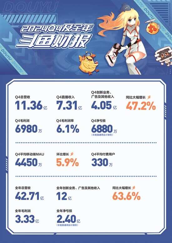 新快报讯 记者郑志辉报道 3月14日,斗鱼发布了2024年第四季度及全年未经审计财务报告,报告显示,2024年第四季度斗鱼营收11.36亿元,全年营收42.71亿元;第四季度毛利润为6980万元,毛利率为6.1%,调整后净亏损为6880万元。 根据财报,斗鱼在收入多元化方面取得了显著进展,创新业务、广告和其他收入实现季度及全年大幅增长,第四季度增长47.2%至4.05亿元,收入贡献达到35.7%,2024年全年该项收入同比增长63.6%至12亿元,其中创新业务连续八个季度增长。第四季度移动端平均MAU为4450万,环比增长5.9%,季度总付费用户数为330万。 财报显示,公司过去一年收入多元化策略卓有成效,业务效率进一步改善,构建了公司长远健康发展的稳固基石。 斗鱼联席CEO任思敏通过财报表示:“2024年四季度,我们保持了公司业务和财务的稳健态势。面对宏观环境的挑战,我们积极优化公司资源配置,增强收入多元化能力,主动缩减低效投入,集中资源稳固平台核心游戏内容生态和公司业务的基本盘。” 商业化进展良好 进一步深化多元化策略 在娱乐内容大供给时代,游戏直播平台能够精准深刻洞察年轻用户需求,并通过高质量内容即时反应,才能与用户建立强黏性。作为国内头部游戏直播平台,斗鱼始终坚持“以游戏为核心的多元化内容生态”战略,深耕内容生态,多维布局,为用户提供更加多元化的创新内容。 赛事方面,2024年第四季度斗鱼共转播超过50场官方大型赛事,并且打造了近40场自制电竞赛事。在自制赛事这一优势领域,斗鱼一方面围绕职业战队、特定主播和主播群体推出创新赛事,如《无畏契约》瓦力杯就集结了8支职业战队;另一方面依托平台的硬核游戏分区优势,延续跨平台的内容合作,例如《王者荣耀》军团杯暨雷霆荣耀杯S2,作为雷霆荣耀杯的全新IP升级,进一步激活分区活跃度,并有效延续官方休赛期的电竞生态热度。 赛事之外,斗鱼也结合各游戏营销节点,针对性地推出平台特色游戏活动,如《王者荣耀》周年庆推出头部主播专属语音包及游戏道具等福利;《欢乐斗地主》18周年庆斗鱼开启欢乐功夫直播周等。斗鱼持续为不同阶段、不同需求的游戏产品打造更加定制化的游戏服务,并为平台用户提供更加丰富的内容体验。 本季度,斗鱼继续在综艺直播上的探索,推出了多档自制直播综艺,如主播齐聚山城重庆探索美食的《城市探险家》;前往边境线体验风土人情的《边境冒险队》,以及粉丝水友共同参与的《开腔吧!歌友》等,围绕主播打造了一系列跨分区的多元化内容。 得益于平台多元化内容驱动增长策略的持续推进,以及游戏会员等商业化活动影响力的提升,斗鱼不断吸引和留存较高质量的用户,第四季度的移动端平均MAU为4450万,环比增长5.9%。 创新业务连续八季度增长 AI将驱动效率持续提升 2024年第四季度,斗鱼在主动缩减低效投入的同时,依托游戏内容生态积极探索收入多元化途径,并且加大了对游戏相关服务及语音业务的推广力度。 据了解,2024年第四季度,斗鱼以游戏道具为主的商业化业务推广频次增加,开拓了更多营销场景,通过线下内容结合线上售卖的方式,提升了用户购买意愿。和平精英分区推出了和平时装周主题集市以及精英手册等营销活动,穿越火线分区推出了年末好物直播节等,游戏人气道具返场及全新道具优惠形成了强大的用户吸引力。 同时,得益于规范的产品设计、有效的招募机制和精准的用户投放,语音社交业务也发展迅速,有效拉动了多元收入提升。 在商业化层面,斗鱼推出分层付费产品,针对核心用户,第四季度继续推广高权益的会员体系和游戏相关产品,提升付费频次;针对泛用户,平台推广低门槛的小额营收产品,结合丰富的游戏内容和平台奖励提升活跃度,满足不同用户需求的同时,保持了整体的付费用户基数。 这些举措显现积极效应,第四季度斗鱼创新业务、广告和其他收入同比增长47.2%至4.05亿元,收入贡献达到35.7%,而2024年全年该部分收入达12亿元,同比大幅增长63.6%,其中创新业务连续八个季度增长。 随着AI技术的快速提升,正在重塑直播生态,斗鱼也在积极拥抱这场行业的深刻变革,将之应用到电竞直播的方方面面,帮助企业降本增效。譬如,2024年,斗鱼通过AI风控等技术重构治理能力、将违规内容拦截在传播前端的关键路径,最终实现行业生态与社会效益的可持续共生。 斗鱼联席CEO任思敏表示:“展望2025年,我们将进一步聚焦收入多元化和成本效率的提升,优化传统业务的成本结构,依托AI技术驱动效率提升,并加速新业务商业化探索,以改善公司整体财务状况,为公司的长期可持续发展奠定基础。”