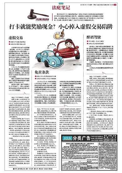 拍案惊奇 购买饮品打卡90天就能奖励现金?保险公司能否以免责条款拒绝保险赔偿?男子两年内酒驾后再醉驾被从重处罚。本期案例关注虚假交易、保险理赔以及醉酒驾驶。法官提醒,面对“以打卡奖励之名,行虚假交易之实”的民事行为,司法不苛求每一位当事人都必须是“道德人”,但决不允许其行为逾越法律边界。 虚假交易 ●连续打卡就能奖励现金 ●法院判决商家承担主责 关某商行在抖音平台经营着一家店铺。2024年5月,关某商行的直播间里正热火朝天地推广一款胶原蛋白肽饮品。他们宣称:购买90瓶就可以参与拍照打卡活动,服用饮品并连续90天在微信小程序上打卡,就能获得2168元的奖励,参与者还能先拿1000元预支奖励,但如果没完成打卡活动需退回预支奖励。 5月25日,听完直播的陈某很是心动,在店铺里一口气买了90瓶饮品,满心期待向抖音店铺客服咨询每日打卡的事宜。当天,陈某就收到了关某商行向其预支的1000元打卡奖励。 随后,关某商行开始引导陈某前往“高某某”微信商城进行虚假交易后,才开始正式打卡。 就这样,陈某一直打卡到第19天,打卡失败了。于是,关某商行便向法院起诉陈某返还预支的1000元打卡奖励款。 地点:广州市黄埔区人民法院 结果:本案中,关某商行是“打卡90天奖励2168元,拍下立即预支1000元”活动的发起者与组织者,店铺利用消费者逐利心理,吸引直播间的粉丝进行下单,还引导消费者在商城平台进行虚假交易,制造商品销售量增加的假象,造成网络营商环境的损害,法院确定商行应当对案涉合同关系无效承担70%的主要过错责任。 陈某作为消费者,基于“2168元打卡奖励现金”诱惑在商城小程序上完成相关商品的虚假交易,起到次要作用,本院确定被告应当对案涉合同关系无效承担30%的次要过错责任。结合本案事实,黄埔法院一审判决:被告陈某于本判决生效之日起五日内向原告关某商行(个体工商户)返还打卡奖励款300元。 一审宣判后双方未上诉,该判决已生效。 法官说法:法律恪守的是规则之治,倡导的是公允、诚信、善治。面对诸如“以打卡奖励之名,行虚假交易之实”的民事行为,司法不苛求每一位当事人都必须是“道德人”,但决不允许其行为逾越法律边界。作为网络销售商,应恪守公平公正的交易准则,不得进行虚假或引人误解的商业宣传,自觉营造良好的商业竞争环境。作为普通消费者,在日常生活中应增强法律意识,自觉抵制参与虚假交易行为,对商家的“奖励”活动提高警惕,维护良好的社会风气。 免责条款 ●保险公司以免责条款拒不认账 ●法院判决保险公司支付理赔款 2021年10月6日,许某在某保险公司为其名下的粤A57×××车辆投保机动车损失保险、机动车第三者责任保险等险种,机动车损失保险的保险金额/责任限额为43622.4元,保险期间为2021年10月20日至2022年10月19日。 2022年10月12日,许某将车停放在洗车房不慎发生火灾,消防救援大队认定火灾原因是车辆内部电气线路故障所致。随后,许某向保险公司申请理赔,但保险公司在事发第二天向其发出《机动车辆保险拒赔通知书》,以车辆是在维修期间发生事故属于免赔事由拒绝理赔。 许某却认为,保险公司拒赔理由不成立,该免责条款属于格式条款,不合理地免除保险公司责任,保险公司未尽到提示、明确告知的义务属于无效条款。况且,在车着火时并非在竞赛、测试期间,也不适用该免责条款,故保险公司应当进行理赔。许某遂诉至法院,要求保险公司赔偿车辆损失43622.4元。 地点:广州市白云区人民法院 结果:法院经审理认为,本案中保险公司提交的条款属于责任免除条款。 关于本案免责条款的效力。法院认为,保险公司提交的两份保单下方均无许某签名,且保单内容未对免责条款进行显著提示。 其次,保险公司未提交证据证实许某签署保单时选择的具体文件是否包含免责声明。因此,法院认定保险公司未就免责条款履行提示和说明义务,不能证明其已明确解释免责条款的概念、内容及法律后果,故免责条款对许某不产生法律效力。 因此,保险公司应履行赔偿责任,其辩称车辆维修起火属于免责范围的理由无法律依据,法院不予采纳。 白云法院一审判决:某保险公司向许某支付保险理赔款43622.4元。 判后,某保险公司不服提出上诉,广州市中级人民法院二审判决:驳回上诉,维持原判。 该案件现已生效。 法官说法:订立保险合同在于防范未知风险,当意外事件发生造成损害时,被保险人希望通过保险合同实现分摊损失的目的,保险公司作为提供格式条款的一方,对于其自行设定的免责条款应尽到充分说明提示义务,如若放任保险公司轻易免责,不仅违背了保险行业的初衷,也破坏了保险的风险分担功能,不利于保险行业健康发展和社会经济秩序的稳定。 法官在此提醒,投保人在订立合同时,应仔细阅读合同文本,对保险专业术语把握不准时,应向保险专员询问清楚再签订合同。保险公司应加强员工培训,提升业务人员的讲解能力,确保条款内容易于理解。同时,保险公司应规范条款表述,主动提示免责条款,并确保合同符合法律法规,保护各方权益。 醉酒驾驶 ●男子酒驾一年后又醉驾 ●法院认定犯危险驾驶罪 某天晚上,陈某与朋友在酒吧喝酒后,驾驶小轿车在某路段与他人驾驶的汽车发生碰撞,造成两车损坏。交通事故发生后,陈某留在现场等候交警来处理,并在事后赔偿事故