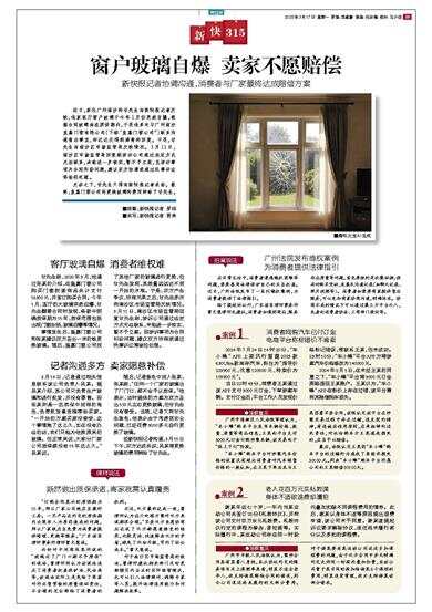 新快报记者协调沟通,消费者与厂家最终达成赔偿方案 近日,家住广州南沙的甘先生向新快报记者反映,他家客厅窗户玻璃于今年1月份突然自爆,根据合同玻璃尚在质保期内,于是他多次与广州南沙皇嘉门窗有