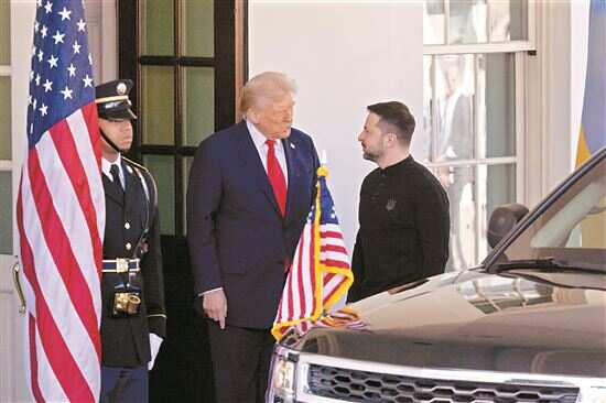■美国总统特朗普(中)和乌克兰总统泽连斯基(右)。新华社发 |