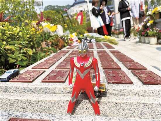 ■一位家长将“奥特曼”放在长眠广东省红十字纪念园的孩子名牌前。 |