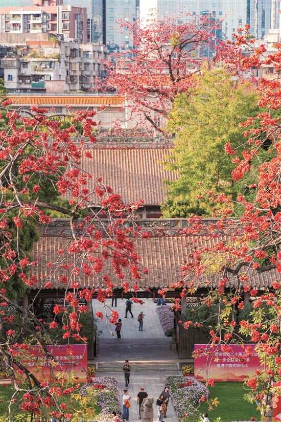 木棉花之于广州,不仅是一道风景,更是一种精神的象征。它们高大挺拔,花朵红硕却不娇弱,即便坠落也掷地有声,恰如广州的气质——务实而热烈、包容而坚韧。人们在花下漫步、跳舞、拍照,享受着木棉花带来的独有的春天气息。年复一年,木棉花开花落,书写着属于这座城市的春天故事。 羊城3月,春意正浓。从珠江畔到深巷里,从斑驳的旧船厂到红墙黄瓦的古朴建筑,木棉花以明艳的姿态和蓬勃的生命力为广州谱写出一曲春日的赞歌。 天河区临江大道旁,几棵木棉树临水而立。晨光中,跳广场舞的市民在树下跳舞健身,衣袂翻飞间,偶有花朵随风飘落,美不胜收。家住附近的李阿姨跳完舞后与几位舞伴一起在木棉树下拍照,她说这段时间的天很蓝,木棉花开得也很漂亮,跳起舞来心情都特别好。临走前,李阿姨还把落在地上的木棉花捡起来装进了袋子里,准备带回家晒干煲汤。 越秀区陵园西路,近五百米的道路上,数十棵木棉树同时盛放,高大的树冠形成连贯的红色廊道,宛如红云覆顶,不时落下的花点缀在马路上,吸引了不少行人驻足拍照。“这里的花真的好壮观,一条路过去全都是!”游客许小姐兴奋地跟记者讲道,她是从湖南来广州旅游的,从小红书上得知此地木棉花开得很壮观,便和两个朋友一起来打卡。 不远处的农讲所,红墙黄瓦在木棉花的映衬下越发古朴典雅,阳光透过花瓣,在琉璃瓦上投下摇曳的光影,游人的身影在花下穿梭,仿佛时光也变得慢了起来。 番禺区上漖村的珠江江畔,几棵高大的木棉树挺立岸边。落花点缀在旧船厂改造的民宿屋顶上,仿佛为这座充满历史记忆的建筑披上了一层红色的诗意外衣。木棉树与远处的新光大桥、洛溪大桥共同勾勒出一条壮丽的风景线,江对岸的“广州之窗”,现代化的玻璃幕墙在阳光下熠熠生辉,与古朴的木棉树形成鲜明的对比。摄影爱好者梁叔约上了几个朋友一起来此处拍照,“这里的花开得真的很漂亮,加上船厂和江对面的景,简直太出片了!” ■策划:夏世焱 文字:郭思杰 图片:郭思杰 夏世焱