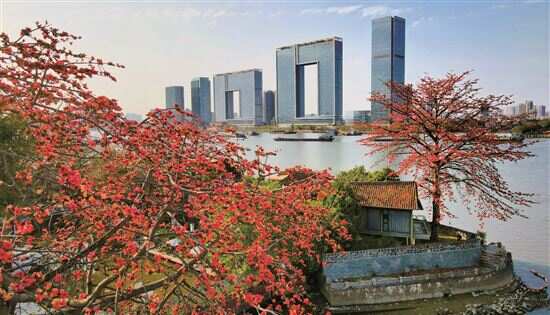■猎德大桥南的木棉花盛放,与珠江新城CBD、猎德大桥共同描绘广州春天的画卷。 |