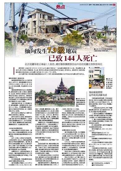 此次地震导致云南省2人轻伤,德宏傣族景颇族自治州启动地震应急Ⅳ级响应 新快报讯 当地时间3月28日12时50分许,缅甸中部发生7.9级地震,震源深度10公里。受地震影响,缅甸内比都、实皆省、曼德勒省、马圭省、掸邦东北部地区及勃固省等受灾区域进入紧急状态。缅甸领导人敏昂莱在缅甸媒体发表讲话说,此次地震已经导致144人死亡、732人受伤。 此次地震导致云南省德宏傣族景颇族自治州2人轻伤,德宏傣族景颇族自治州快速启动地震应急Ⅳ级响应。 缅甸首都进入紧急状态 缅甸国家管理委员会28日发布消息说,当天中午,缅甸曼德勒市区东北方向约20公里处(北纬22.09度、东经96.23度)发生地震,并监测到约3次余震活动。 缅甸国家管理委员会说,受地震影响,缅甸首都内比都、实皆省、曼德勒省、马圭省、掸邦东北部地区及勃固省等受灾区域进入紧急状态。缅甸政府将迅速对上述受灾地区展开损失调查及紧急救援工作,并确保提供必要的自然灾害救助与人道主义援助。 据缅甸媒体报道,28日强震发生后,缅甸曼德勒一座清真寺坍塌,造成至少10人丧生。另有曼德勒当地民众通过社交媒体发布消息说,有一栋建筑倒塌,四五人被困。 新华社驻内比都雇员说,首都内比都部分学校和办公楼倒塌。 新华社驻仰光记者说,缅甸首都内比都、最大城市仰光震感强烈。记者尝试联系曼德勒地区友人,但无法接通。记者了解到,曼德勒省部分建筑倒塌,曼德勒到仰光一些道路受损中断。 云南省多地震感强烈 缅甸地震波及到我国云南省。新华社记者从云南省地震局获悉,此次地震导致云南省德宏傣族景颇族自治州2人轻伤。 此外,记者从云南省内多地获悉,云南省昆明市、保山市、德宏傣族景颇族自治州等多地震感强烈。据了解,昆明市区有明显震感,部分小区居民离开室内,到楼下空旷地面避险;位于中缅边境的瑞丽、腾冲市区震感强烈,吊灯、窗户明显摇晃,阳台花盆掉落。 地震发生后,云南省高度重视、及时响应。德宏傣族景颇族自治州人民政府快速启动地震应急Ⅳ级响应,开展抗震救灾工作。 针对缅甸地震,中国地震局迅速启动境外地震应急响应机制。 据中国地震台网测定,28日14时20分在缅甸(北纬21.85度,东经95.95度)发生7.9级地震,震源深度30公里。震中距我国边境线最近约294公里,距云南瑞丽市政府驻地约310公里,距昆明市政府驻地约776公里。14时32分,震中附近发生6.4级余震。据了解,云南德宏、临沧、保山、西双版纳、丽江、大理等地震感强烈,楚雄、昆明等地震感明显。 地震发生后,中国地震局视频连线中国地震台网中心、云南省地震局、广西壮族自治区地震局、贵州省地震局,了解震情、灾情等情况,组织开展滚动会商研判,调度派出云南省地震局现场工作队赶赴瑞丽市协助地方政府开展应急处置工作。 缅甸强震“震动”东南亚 此次地震发生后,迅速“震动”了东南亚。 驻老挝首都万象、泰国首都曼谷等地的新华社记者说,当地均有强烈震感。万象市三层以上建筑普遍有明显震感,高层建筑居民在家中感受到剧烈摇晃。记者在曼谷看到民众从写字楼、住宅楼和会展中心疏散。 而中国驻清迈总领馆28日发布消息说,缅甸境内当天发生强烈地震,泰国北部清迈、夜丰颂等府震感较强,夜丰颂拜县部分景点发生坍塌。 据救援现场指挥中心最新数据,地震引发的曼谷高楼倒塌已致5人死亡、9人受伤,目前仍有117人失踪。 另据泰国防灾减灾厅28日发布的消息说,强震造成曼谷及其附近地区,泰国北部、东北部、中部和南部地区均有震感。目前官方正在核实具体信息和受损情况。 当天在普吉府视察的泰国总理佩通坦在地震发生后返回曼谷并召开紧急会议,她在会后表示,相关部门正在高楼倒塌现场开展搜救工作。 地震会影响云南边境 据中国地震台网消息,本次强震是今年以来全球发生的第17次六级及以上地震,也是今年以来的最大地震,接着发生的6.4级强余震则是第18次六级及以上地震。 3月28日,中国科协地球物理信息科学首席传播专家陈会忠表示,缅甸处于印度板块和亚洲板块之间,位于欧亚地震带上,历来地震多发。但具体断层、成因还需要看观测情况。 陈会忠表示,后续发生更大规模地震的概率不大,但可能会有5级至7级的余震,就像刚刚发生的6.4级余震一样。 陈会忠还表示,由于震中地处内陆,发生海啸的可能性不大,但对云南边境地区会带来一些破坏,需要防范山体滑坡等次生灾害风险,而距离更远的中国其他地区受影响不会太大。 我驻缅使领馆公布相关求救电话 中国驻缅甸使领馆第一时间启动应急机制,密切关注地震灾情和在缅同胞受灾情况,全力以赴开展应对工作。为确保在缅同胞人身财产安全,特提醒以下注意事项: 一、加强自身安全防范,及时了解掌握地震自救知识,适当储备饮用水、食品、防灾急救用品等应急物资。 二、密切关注地震动态、气象预警和防灾信息,保持通讯设备畅通,防范余震及山体滑坡、火灾、传染性疾病等次生灾害。 三、遵从当地政府疏散安排和撤离指引,积极配合现场管理人员指挥,尽快转移至安全地带。 四、如遇紧急情况,请及时报警并联系驻缅甸使领馆求助。 缅甸报警电话:0095-199、0095-12323199 缅甸医疗急救电话:0095-192 驻缅甸使馆领事保护电话:0095-943209657 驻曼德勒总领事馆领事保护电话:0095-9259172726 外交部全球领事保护与服务应