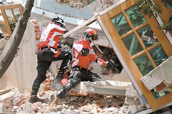 ■3月30日,在缅甸曼德勒,中国救援队队员在长城饭店开展救援。新华社发 |