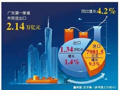 据统计,今年第一季度,广东外贸进出口2.14万亿元,较去年同期(下同)增长4.2%,增速高于全国2.9个百分点。其中,出口1.34万亿元,增长1.4%;进口7981.5亿元,增长9.3%。这是新快报记者4月17日从海关总署广东分署获悉。 ■新快报记者 麦婉诗 通讯员 陈琳 吕美锦 民企进出口1.36万亿元,占比超六成 数据显示,广东进出口增速逐月回升,规模创历史同期新高。第一季度,广东外贸扎实起步,在1月下降3.7%的情况下,2月、3月迅速扭负转正,分别增长3.1%、14%,第一季度进出口、出口、进口规模均创历史同期新高。 民营企业活力不断增强,外商投资企业增速最快。第一季度,广东民营企业进出口1.36万亿元,增长4.8%,占广东进出口总值的63.4%,较去年同期提升0.4个百分点。同期,外商投资企业发展向好,进出口6770.3亿元,增长5.3%;国有企业975.7亿元,下降10.6%。 一般贸易保持平稳,保税物流大幅增长。第一季度,广东以一般贸易方式进出口1.24万亿元,增长1.6%,占进出口总值的57.8%。同期,保税物流进出口4536.3亿元,增长19.4%,增速快于整体15.2个百分点;加工贸易4269亿元,下降1.8%。 东盟保持广东第一大贸易伙伴地位 据统计,第一季度,东盟继续保持广东第一大贸易伙伴地位,广东对其进出口3494.3亿元,增长6.9%。同期,对中国香港、欧盟、美国、中国台湾等其他前五大贸易伙伴进出口分别增长6.8%、6.9%、3%、36.3%。此外,对共建“一带一路”国家进出口增长3.3%。 出口方面,第一季度,广东出口机电产品9042.7亿元,增长6.6%,占广东出口总值的67.5%。其中,电脑及其零部件、电工器材、家用电器等主要出口商品分别增长19.6%、13.3%、6.4%;电动汽车、摩托车、船舶等出口较快增长,分别增长107.9%、46.5%、32.2%。同期,出口劳动密集型产品、钢材分别下降13.2%、57.8%。 进口方面,进口高端制造与民生消费品并重。第一季度,广东进口机电产品5548.3亿元,快速增长24.2%,占广东进口总值的69.5%。其中,电脑及其零部件、半导体制造设备、集成电路等重要电子零部件及设备进口分别增长167.4%、92.8%、12%。同期,美容化妆品及洗护用品、乳品、水产品等部分民生消费品进口需求回暖,分别增长28.1%、23%、17.9%。