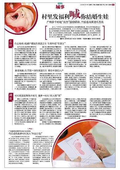 广州多个村社“出力”鼓励婚育,三胎最高奖励5万元 近日,广州市白云区龙归街南岭村公布初婚奖励政策,另外生育补贴政策也正在走流程有待表决。记者梳理发现,从2023年开始天河猎德村“打响头炮”