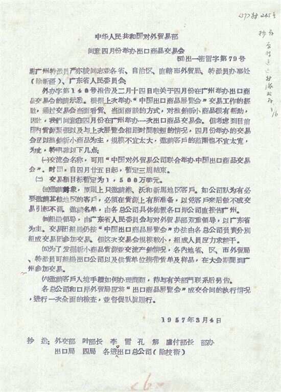▲《中华人民共和国对外贸易部同意四月份举办出口商品交易会》(1957年3月4日)。 |