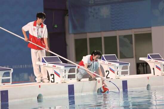 水球比赛中,志愿者将打落在外的水球捞回来,保持场地整洁。 |