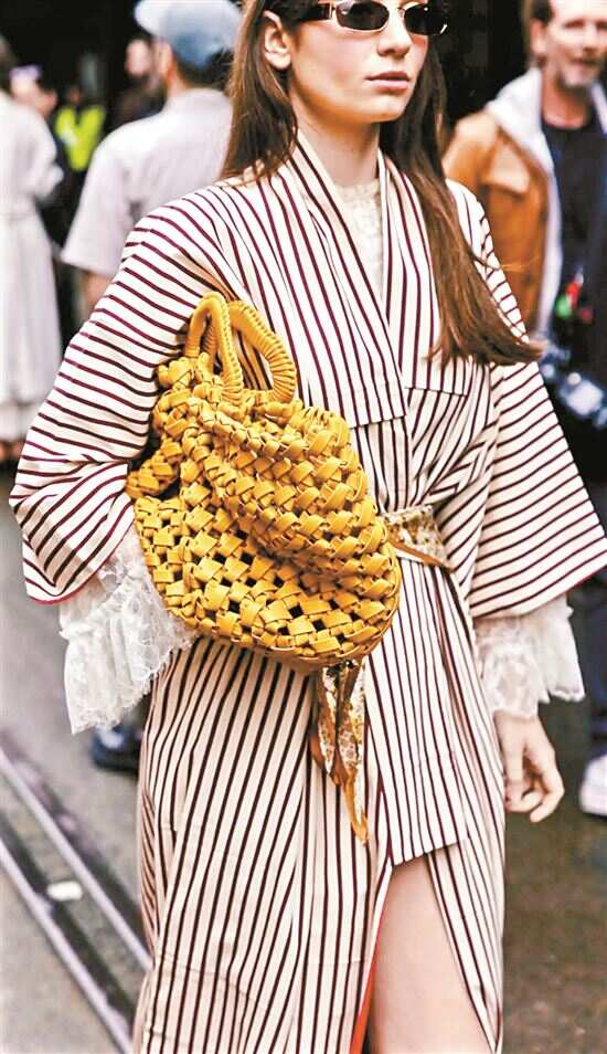 皮革编织的镂空网格包时装味更浓,能让基本款搭配起来更有高级感。 |