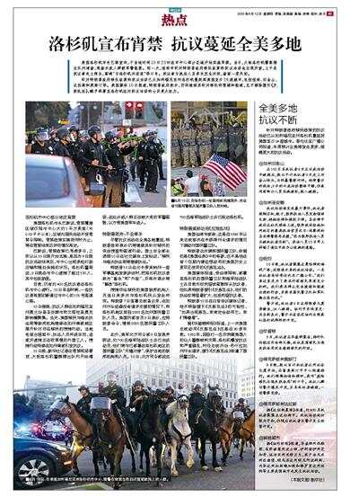 美国洛杉矶市长巴斯宣布,于当地时间10日20时在市中心部分区域开始实施宵禁。当日,大批洛杉矶警察摆出队列清场,现场示威人群被军警驱散。同一天,纽约市针对特朗普政府移民政策的抗议活动也出现升级,上