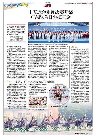 昨天上午,第十五届全国运动会群众赛事活动龙舟项目决赛在佛山市南海区丹灶镇仙湖火热开桨。23支队伍云集于此,在湖上展开狂飙好戏。首日比赛,广东龙舟队不负众望,包揽全部3枚金牌。 ■采写:新快
