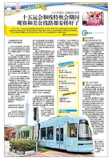 ■十五运会期间,游客和市民不妨搭乘全运号主题有轨电车,边叹美食边看比赛。 新快报记者 毕志毅/摄 |