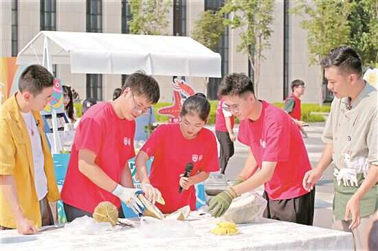 ■海南三亚优旗榴莲科技小院的同学们正在介绍国产树上熟榴莲。王心悦/摄 |