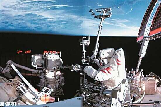 ■3月21日在北京航天飞行控制中心拍摄的神舟十九号航天员蔡旭哲在空间站组合体舱外工作的画面。新华社发 |