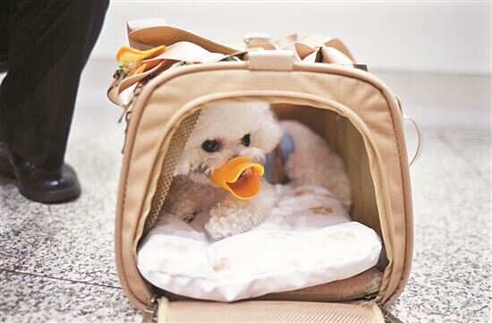 ▲比熊犬按照规定被放进宠物登机软包。 |