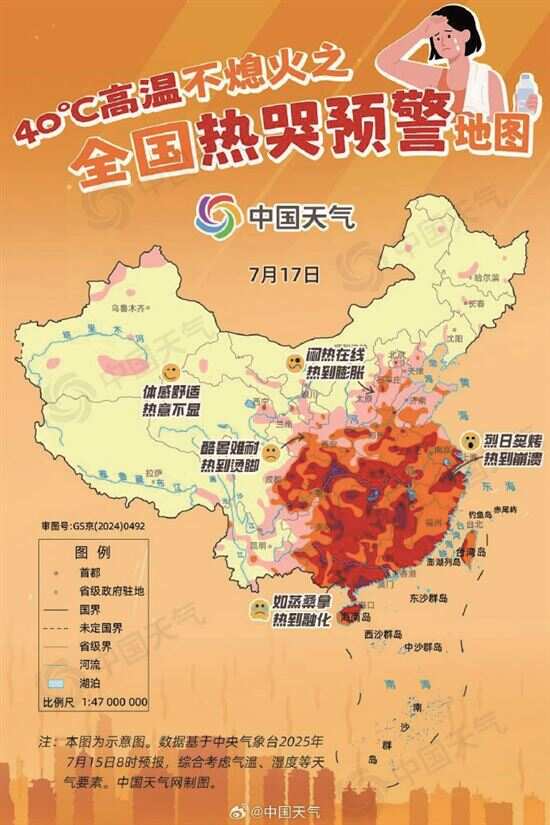 7月15日,“郑州路面超72℃”这一话题迅速在网络上引发热议,不少网友对此表示惊讶和怀疑。记者现场实测煎蛋烤虾,经一个小时的暴晒,温度计“爆表”超50℃,虾由灰变红,部分蛋液凝固。此前,受高温和高湿双重影响,北京“出门就像被牛舔了一口(身上黏黏糊糊)”也一度冲上网络热搜。 7月热浪席卷全国,黄淮、江淮、江汉、江南等地高温日数普遍达到5至8天,部分地区甚至持续9至13天。烈日炙烤下,大地持续升温,各地热浪滚滚。 气温不断突破极值 据河南气象,7月15日7时至17时,河南省大部出现37℃以上高温天气,局部40℃到44℃,其中高于40℃的有111个县(市、区)共481站。国家气象站区域站最高气温前3站分别为:偃师区喂北44.4℃、荥阳市张庄44.2℃、巩义市凤凰岭44.2℃。 据中国天气网消息,7月16日依然是大范围高温的强盛时段,陕西、河南、湖北等地部分地区最高气温可达37℃至39℃,局地将出现40℃以上极端高温。 7月3日至8日以及7月12日以来,我国接连出现两轮大范围高温天气过程。其中,7月3日至8日,全国超过35℃的影响区域达315万平方公里,影响人口达到9.2亿,山东烟台、江苏盐城等11个国家级气象观测站最高气温突破历史极值。 15日至16日本轮高温进入最强盛时段,29个省(自治区、直辖市)的1400个国家级气象观测站出现35℃以上的天气,陕西西安、咸阳、宝鸡等地的最高气温突破42℃,新疆吐鲁番市东坎更是飙升至45.7℃。8个国家级气象观测站最高气温突破历史极值。 东北地区同样遭遇高温天气,辽宁部分地区最高气温超40℃,平均气温创25年来新高,超80%的地区最高气温突破33℃。 中国气象网预计,16日至20日,黄淮、江汉、江淮、江南北部、陕西关中、四川盆地等地将持续35℃以上高温天气,部分地区最高气温可达39℃~42℃。 高温全天在线 此次高温不仅强度强,而且一天之中持续时间也长。像山东西部、河南中部、陕西关中以及新疆吐鲁番盆地的部分地区,一天中高温持续时间可能长达12个小时。 不仅如此,最低气温也居高不下,夜间高温同样令人难以忍受。华北南部及其以南的大部区域夜间最低气温普遍在25℃以上,陕西关中、河南中南部、山东西部、江苏中部、湖北中部、湖南北部、重庆西南部等地最低气温可达30℃或以上,暑热感全天候在线。 数据显示,2000年以来,北京、天津、郑州等地最低气温高于28℃的天数显著增加,南昌的最低气温高于28℃的日数已从上世纪末的年均5至7天增至近10年的21.7天。 预计17日起,高温将逐步缩减,但对于陕西关中、河南到长江中下游一带不少地方来说,高温较为持久,未来一周高温日数仍可能达5天以上,需关注持续高温对人体健康的不利影响,谨防中暑。 今年为何格外热? 副热带高压,可以说是我国夏季天气变化的幕后大BOSS,它的一举一动都将改变天气格局。与往年不同,今年由于副热带高压位置异常偏北,北方多地闷热程度同期少见。 副热带高压主导了我国中东部地区夏季的雨热进程,从南到北,何时开启雨季,何时开始晴热,以及台风的发展走向等都与副高的强度、范围和结构的变化有着密切的关系。据报道,今年盘踞在我国的副热带高压的“北抬”较往年偏早偏强。副热带高压控制我国中东部地区的同时,引导着夏季风北推,将季风携带的水汽和热量输送到北方地区,造成低层湿度增大。此外,副热带高压控制的区域以晴到少云天气为主,增强了白天的辐射升温,由此形成了目前我们感受到的湿热型高温热浪。 局部体感45℃!被高温硬控 此轮高温中,南北地区人体体感差异显著:北方以“晴晒炙烤”为主,烈日灼人;而江淮、江汉及以南地区受西南暖湿气流影响,湿度居高不下,“闷蒸感”使体感温度远超实际气温。 7月16日,大范围高温仍持续,体感温度超过45℃的区域达到最大,河南东部和南部、安徽北部、江苏北部、江西中部、湖南北部、湖北中部和东部等地都将体验热到崩溃的感觉。江南、华南等地不少地方热力升级,广东西部和东部、浙江南部等地体感温度可达40℃至45℃,热如“蒸桑拿”,焖蒸感十足。 相关 新台风正在生成 或“奔向”广东 有个好消息,广东街坊等的雨很快要来了。 7月16日14时,原位于菲律宾以东洋面的热带扰动发展为热带低压。截至16日20时,该热带低压位于距离菲律宾马尼拉偏东方向约930公里,预计将以每小时20公里左右的速度向西偏北方向移动,最强可达台风级或强台风级,并逐渐向海南岛东部到广东中西部一带沿海靠近。 预计18日起,受热带扰动靠近及其外围环流的影响,广东中东部将有明显的雷雨;受降水影响,广东中东部地区将率先获得退出“广东高温群”的资格。展望19-20日,受热带扰动的影响,广东有一次明显的降水过程。 根据广州市气象台预计,自18日起,广州可能持续受到热带系统外围环流影响,雷雨天气明显。预计下周初期,广州市区最高气温将逐渐降至30℃左右。 文图来源:综合中央气象台、广东天气、广州天气、大象新闻、河南气象、人民日报等