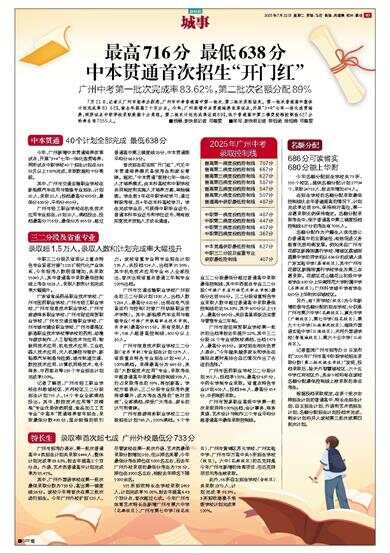 广州中考第一批次完成率83.62%,第二批次名额分配89% 7月21日,记者从广州市招考办获悉,广州市中考普通高中第一批次、第二批次录取结束。第一批次普通高中整体计划完成率83.62%,较去年提高2个百分点。今年,广州新增中本贯通培养改革试点,开展“3+4”七年一体化连贯培养,两所试点中职学校录取数据十分亮眼。第二批次计划完成率达到89%,低于普通高中第三梯度投档控制线627分的考生有7055人。 ■统筹:新快报记者 邓善雯 ■采写:新快报记者 陈钰涵 徐绍娜 邓善雯 2025年广州中考 录取控制线 普高第一梯度投档控制线 707分 普高第二梯度投档控制线 667分 普高第三梯度投档控制线 627分 普高第四梯度投档控制线 587分 普高第五梯度投档控制线 547分 普高第六梯度投档控制线 507分 普通高中录取最低控制线 487分 中职第一梯度投档控制线 487分 中职第二梯度投档控制线 447分 中职第三梯度投档控制线 407分 中职第四梯度投档控制线 367分 中本贯通录取最低控制线 627分 中职三二分段及省重专业 录取最低控制线 407分 中本贯通 40个计划全部完成 最低638分 今年,广州新增中本贯通培养改革试点,开展“3+4”七年一体化连贯培养,两所试点中职学校40个招生计划在638分及以上100%完成,录取数据均十分亮眼。 其中,广州市交通运输职业学校在新能源汽车运用与维修专业招生,计划20人,录取20人;投档最高分690分,最低分638分,平均分650分。 广州市轻工职业学校在机电技术应用专业招生,计划20人,满档投出,投档最高分716分,最低分为655分,超过普通高中第三梯度线28分,中本贯通班平均分669.3分。 首次招生即实现“开门红”,可见中本贯通培养模式备受考生和家长青睐。据知,“中本贯通”班按七年一体化人才培养模式,由本科高校和中职学校共同制定和实施人才培养方案,单独编班。学生前3年在中职学校学习,通过转段考核,后4年在本科高校学习。学生完成学业后,可获得中职毕业证书、普通本科毕业证书和学位证书,将有效拓宽技术技能人才成长通道。 三二分段及省重专业 录取超1.5万人,录取人数和计划完成率大幅提升 中职三二分段及省级以上重点特色专业紧密对接“12218”现代化产业体系,今年报考人数明显增加,共录取15040人,其中普通高中录取最低控制线上考生5823人,录取人数和计划完成率大幅提升。 广东省食品药品职业技术学校、广州市医药职业学校、广州市轻工职业学校、广州市信息技术职业学校、广州市旅游商务职业学校、广州市财经商贸职业学校、广州市交通运输职业学校、广州市城市建设职业学校、广州市番禺区新造职业技术学校等学校的药剂、动漫与游戏制作、人工智能技术与应用、物联网技术应用、机电技术应用、工业机器人技术应用、无人机操控与维护、新能源汽车制造与检测、城市轨道交通、数控技术应用、计算机网络技术、电子商务、中西面点等289个专业招生计划完成率100%。 记者了解到,广州市轻工职业学校在科教城校区、天河校区三二分段招生计划715人,14个专业全部满档投出。其中,数控技术应用等“双精准”专业优势依然明显,食品加工工艺专业“中高本”贯通培养首年招生,录取最低分数490分,显示较强的吸引力。该校省重专业两专业招生计划135人,共投档124人,出档率91.85%,其中机电技术应用专业45人全部投出,首次出现省重点普通三年制专业100%出档。 广州市交通运输职业学校广州招生的三二分段计划1330人,出档人数1284人,最高分622分,出现在电气设备运行与控制(对接广州铁路职业技术学院)。其中,新能源汽车运用与维修专业(对接广州铁路职业技术学院,长学制)最高分611分。所有录取人数中,586人超普高控制线,600分以上30人。 广州市信息技术职业学校三二分段(含长学制)专业招生计划1375人、省级重点特色专业招生计划440人,100%满档。录得最高分为645分,来自“大数据技术应用”专业,录取考生中超普通高中录取最低控制线993人,约占录取考生的59%,再创新高。学校方面表示,三二分段专业报考热度持续攀升,成为考生选择的“绝对顶流”,全部满档,深受广大考生、家长的认可和青睐。 广州市旅游商务职业学校三二分段招生计划765人,100%满档。5个专业三二分段最低分超过普通高中录取最低控制线,其中中西面点专业三二分段(对接广东省外语艺术职业学院)最低分达到556分。三二分段省重特色专业录取人数中超过普通高中录取最低控制线的达56.33%,其中600分以上13人,最高分640分,来自高星级饭店运营与管理专业三年制。 广州市财经商贸职业学校第一批次的出档率较去年提升22%,其中三二分段26个专业或院校满档,出档1573人,最高分653分。该校招生相关负责人表示,“今年越来越多家长和学生在填报志愿时是结合自己情况作出了合适的选择。” 广州市医药职业学校三二分段计划350人,投档率100%,最高分637分,中药长学制专业录取。省重点特色专业计划603人,投档346人,最高分614分,中药制药录取。 广州市贸易职业高级中学第一批次录取同样100%出档,会计事务、商务英语、艺术设计与制作三个专业平均分超普通高中最低录取控制线。 特长生 录取率首次超七成 广州外校最低分733分 广州市招考办表示,第一批次普通高中4类招生计划共录取6444人,整体计划完成率83.62%,较去年提高2个百分点。外语、艺术类普通高中计划完成率为85
