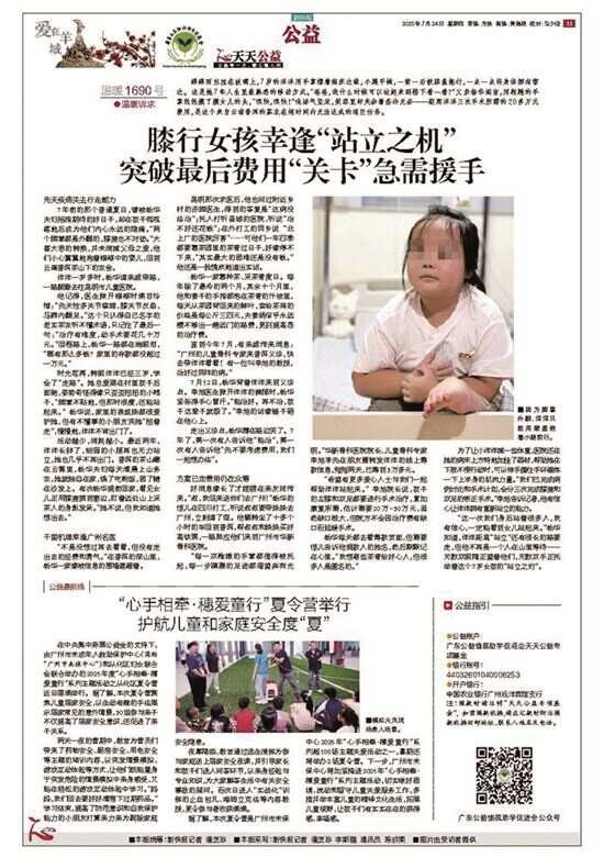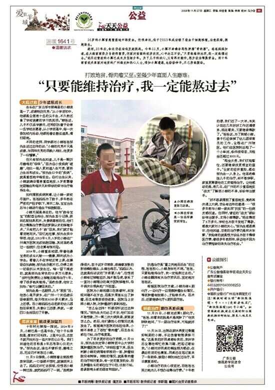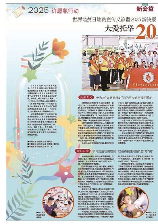 新快报“天天公益”的温暖足迹与城市担当 当生命在病痛中发出微弱的呼救,我们是倾听者,也是传声者;当城市在慈善路上探索创新,我们是记录者,也是推动者;当平凡人的善举闪耀微光,我们是见证者,更是传播者。 十五载春秋流转,新快报天天公益,如一盏不灭的烛火,将媒体的职业使命与公益慈善的赤诚之心紧密交织,在广州这座温暖之城的地图上,刻下了一道道清晰而深情的足迹——那是用“脚力”丈量疾苦、用“眼力”洞察需求、用“脑力”创新模式、用“笔力”传递大爱的坚实印记。 2025年,这束公益烛光,迎来了它照亮人间的第十五个年头。 脚力:行至困苦之处,搭建希望之桥 新闻的生命在基层,公益的根基在民间。新快报公益记者,深知此律。他们的足迹,总是第一时间抵达最需要光亮的地方。 云浮市郁南县的16岁少年家辉,是新快报记者心中沉重的牵挂。这个被广州地贫家长会的妈妈们疼惜的孩子,11年前经天天公益报道募捐,完成了骨髓移植,走出重型地贫的阴影。然而2024年,刚刚升入高中的他,又猝然跌入骨肉瘤的深渊。“习惯了……”阳光少年面对病魔的平静低语,刺痛了所有听闻者的心。 病床边,药水味与叹息声混杂,家辉爸爸泛红的眼眶里深藏恐惧,又写满坚韧……“我们不会放弃,但筹钱已力不从心。”无奈的父亲低声说,“治疗费缺口还很大。” 2024年11月27日,一篇饱含温度与力量的报道,将家辉的困境推入公众视野,他成为天天公益版面上第1641个承载着社会关切的“温暖编号”。 这座由新闻纸搭建的桥梁,迅速连接起爱心的海洋。报道刊发后,广东公益恤孤助学促进会“重症病童”项目迅速跟进,紧急救助款如及时雨般送达家辉手中,暂缓了这个家庭的燃眉之急。 从倾听诉求到实地探访,从真实记录到资源链接,天天公益的“脚力”,丈量着困境的距离,也缩短了希望抵达的时间。 家辉的故事,只是天天公益报道中的一个缩影。曾为寻找被拐儿子杨剑锋颠沛千里,抱憾离世的母亲,在26年的泣血寻子路上,让无数读者唏嘘;身患重症,在病痛与家庭变故中挣扎的少年冯宇恒,也牵动无数人的心弦;刚步入社会便被急性白血病击倒、怀抱音乐梦想的河源大学生小科,曾唤起社会各界的深切同情……每一次困境的呼唤,天天公益记者都未曾缺席。他们的脚步,踏遍城市角落、乡村阡陌、医院长廊、陋室蜗居,将那些被遮蔽的困境真实呈现,为无助者搭建起一座座通往希望的坚实桥梁。 在倾听,在记录,在陪伴;齐众心,集众力,汇众爱。新快报天天公益,从未停歇。开版十五年,新快报天天公益持续关注困难群体,聚焦社会问题,以慈善救助为主线,共计推出万余篇公益报道,惠及数万名困难群众,以及未能详细计数的关联人群。