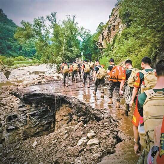 ■7月28日,武警北京总队官兵徒步10余公里前往怀柔区琉璃庙镇运送物资。新华社发 |